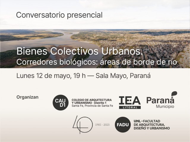 El lunes 12 de mayo de 2025, de 19 a 21 h, se realizará en la Sala Mayo de la ciudad de Paraná el primero de una serie de cuatro conversatorios presenciales organizados por el Colegio de Arquitectura y Urbanismo de la Provincia de Santa Fe – Distrito 1 (CAUPSF D1) y el Instituto de Estudios Avanzados del Litoral (IEAL – UNL).