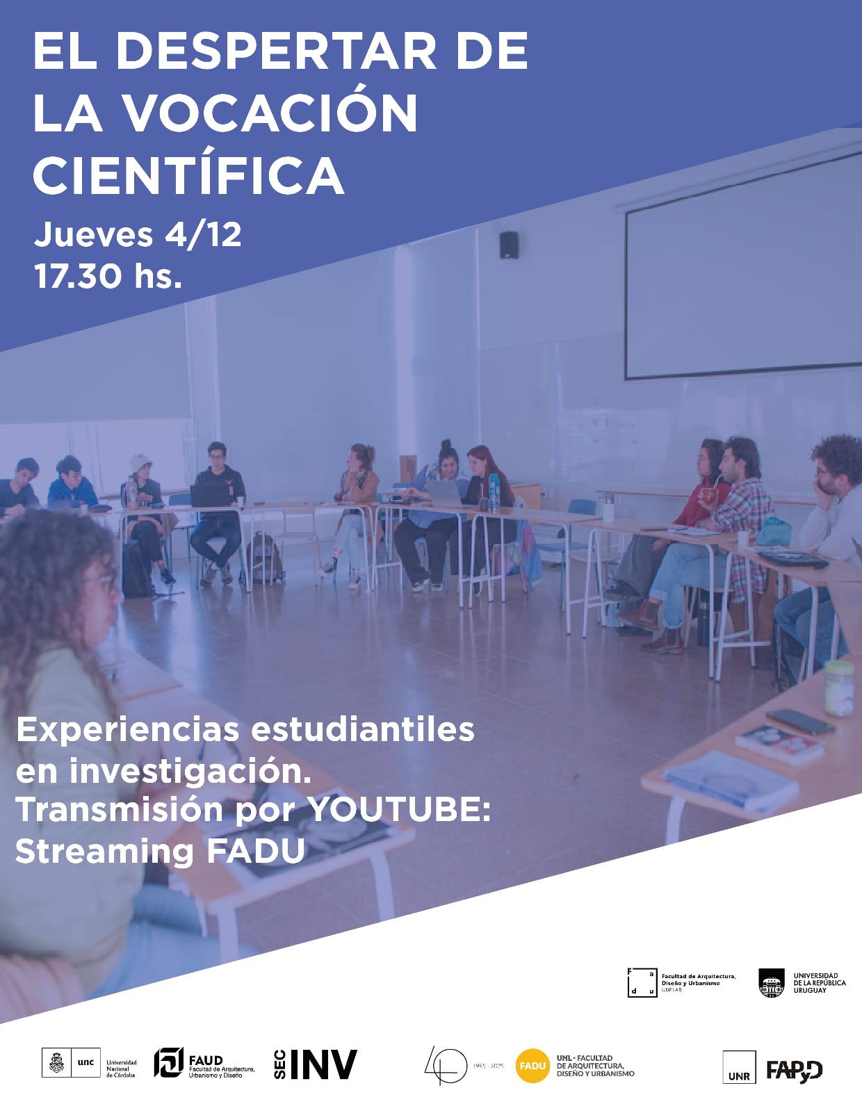 El próximo jueves 4 de diciembre de 17:30hs. a 19300hs. tendrá lugar una nueva edición de El despertar de la vocación científica: Experiencias contadas por los estudiantes V, transmitido por la plataforma YouTube, en el canal streaming FADU UDELAR (https://www.youtube.com/@streamingfadu)