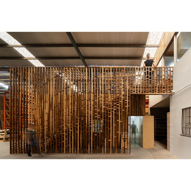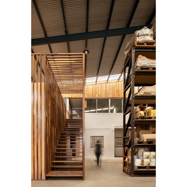 El proyecto interviene sobre la planta de logística en Rosario de Maderas Selectas, un grupo maderero argentino con aserraderos en Misiones y plantas en Rosario y Santa Fe. La planta había crecido de manera desorganizada con el tiempo, generando problemas que impactaban en los tiempos de procesamiento y entrega de materiales. La propuesta arquitectónica trabaja sobre esa preexistencia y la reordena en una superficie de 300 m², construida en 2024, en la que la madera es el material estructural y expresivo central —una elección que dialoga directamente con la identidad productiva del comitente.